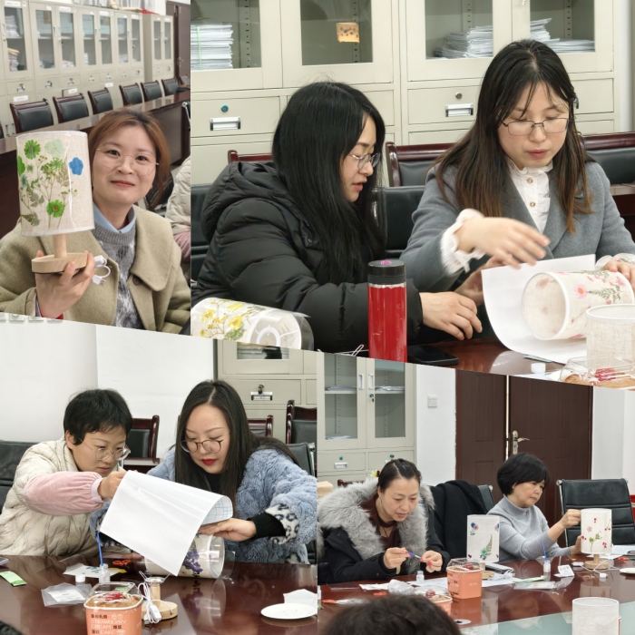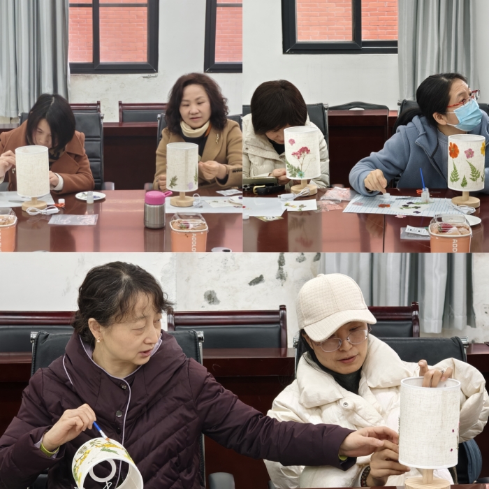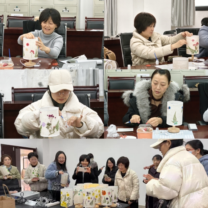 随后,大家认真学习了压花灯的制作步骤和技巧。压花灯是一种将干花、树叶等自然素材通过特殊工艺压制在灯罩上,形成独特图案和光影效果的装饰灯具。完成视频自学后,大家纷纷拿起手中的材料,发挥自己的创意和想象力,开始制作属于自己的压花灯。有的老师钟情于淡雅的色调,以绿叶虬枝搭配浅粉色的干花,营造出一种清新脱俗的氛围;有的则偏爱热烈的色彩碰撞,用大红色的纸配上五颜六色的花朵,让整个花灯看起来充满活力与热情。大家一边制作,一边还互相交流着心得,欢声笑语回荡在整个活动室。