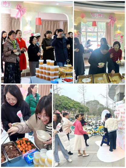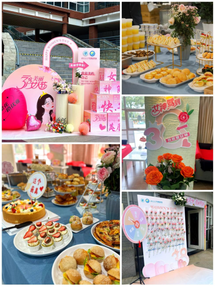 在精心布置的活动场地,“三八节”主题立体花墙,在鲜花、彩球、飘带映衬下烘托出热烈的节日氛围,吸引了不少师生驻足留影。餐台上,精致而丰富可口的食品、点心,搭配着一幅幅“致最美的自己”主题卡片,增添了几多温馨与诗意。