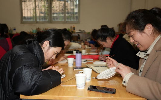 当天下午,为有效缓解女员工的工作压力,提升艺术修养与生活品质,后勤保障部还精心策划了“心随手动画乐章·展示巾帼风采新形象”手绘青花瓷艺术体验活动。近60名女员工满怀期待地前往学校设计艺术学院建筑与设计实验中心陶艺工作室,深入探索中国青花瓷的历史渊源与现代价值,并在老师的悉心指导下亲手绘制青花瓷作品。整个体验过程不仅让她们深刻领略了青花瓷的文化内涵,更让她们充分感受到了传统工艺的独特魅力与无穷韵味。